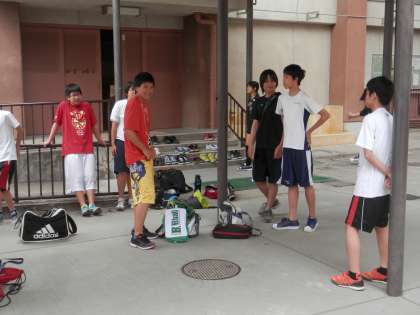 体育館の外では、男女のバスケットボール部の生徒たちがアリーナの空くのを待っています。