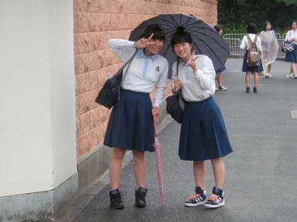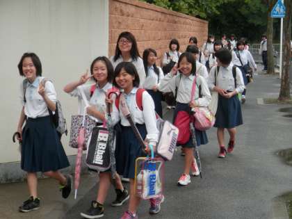 登校途中、笑顔で立ち止まる生徒たちです。