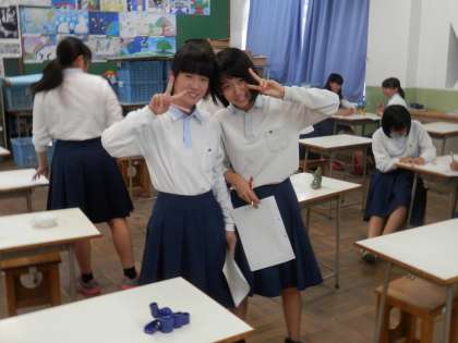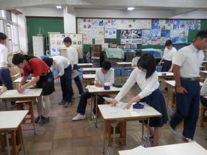 美術の時間には、2年生の頃に焼いた作品の品評会をしていました。