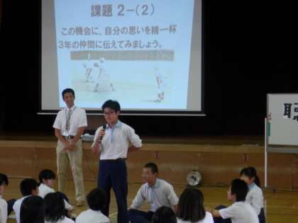 「起りーつ、礼、着席!」大きな声での号令で3年学年道徳が始まりました。順調に授業は進行します。3年の先生方は打ち合わせ通り動きます。グループ討議に時間を使いすぎましたが、代表者の上手い発言で、それを聴く生徒や保護者の感性が研ぎ澄まされていき、授業を楽しんでいる様子が分かります。特別ゲスト(資料の主人公本人)の登場です。これは、3年の教師にも秘密で進めてきました。サプライズ大成功です。彼からのメッセージを受けて、3年生にコメントを求めます。「この機会に3年の仲間に思いを伝えましょう。」手が上がりました。「ラグビー部のみんなへ。これまで一緒に練習を重ねてきて、もうすぐ終わりやけど…」大きな拍手が起こりました。次は続くでしょうか。野球部の監督が大きな声で生徒を指名しました。「○○、行け!」颯爽と手が上がりました。「3年のみんな、これまで一緒に生活してきて、ホンマにええ学年やと思うし、あと10か月…」「バレー部のみんなへ…」「3年の仲間へ…」