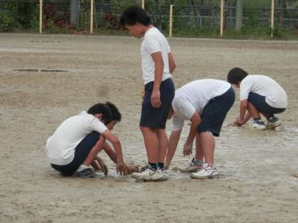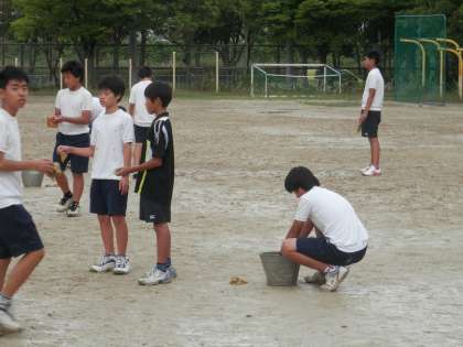 グランドの西では、今日も男子テニス部がコート整備に精を出しています。