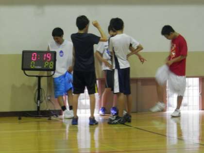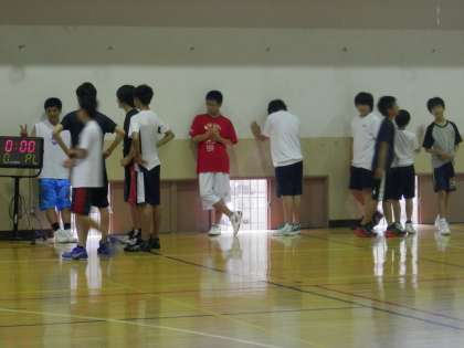 体育館では男子バスケットボール部が練習を始めようとしています。