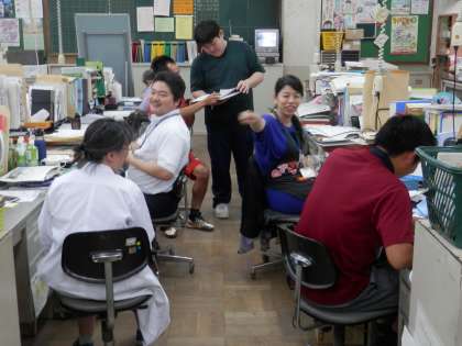 職員室で楽しそうに仕事をする1年の先生方のショットとともにどうぞ!