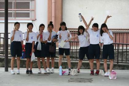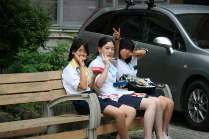 吹奏楽部の人たちが校舎から出てきて中庭で昼食を食べ出しました。