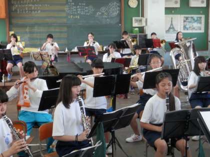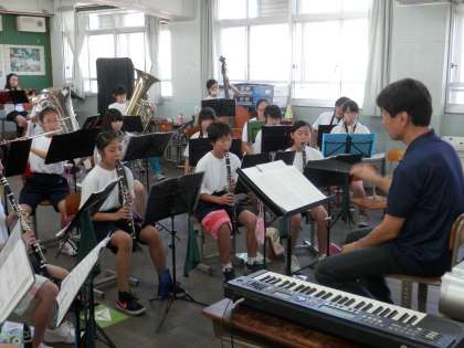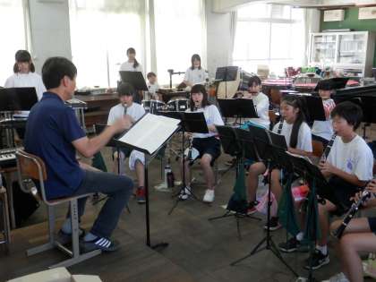 音楽室では、今日もブラスバンド部が真剣に練習をしています。