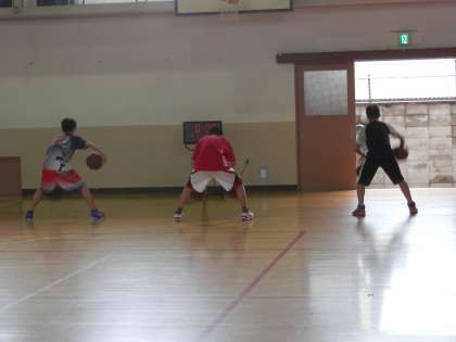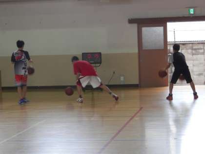 バレー部の隣では、今日も男子バスケットボール部が基礎練習に励んでいます。