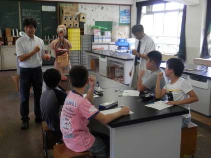 理科では、人体模型を使って循環器のはたらきについて学んでいました。