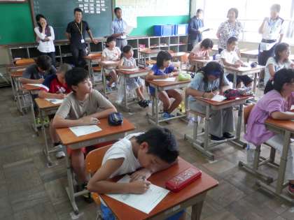 「小学校だと言うだけやけど、中学校では書くことを知れました。(※小学校は「話す」が中心で「書く」をしません)今日の体験学習で中学校は楽しいということも知れました。だから、早く小学校を卒業して中学校に来たいです。授業中もとっても楽しいし「いい」と思いました。あとこの授業で、他の小学校の人とも仲良くなれたし、女子にも普通にしゃべれたし、先生ともしゃべれて「いいな」と思いました。 後略」二の丸小男子