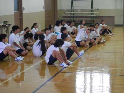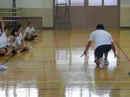 女子は体育館で陸上の基本動作の練習です。