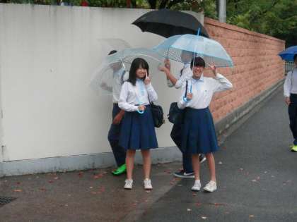 雨にも負けず… ではありませんが、これしきの雨では本校生徒の笑顔を消すことはできません。
