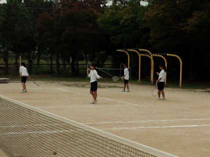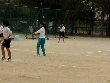 体育館では女子バレー部、そして、現在もグランドでは女子テニス部が活動しています。両方とも明日に公式戦を控えています。