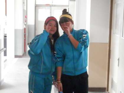 開会式直前、女子はトイレの鏡を使って鉢巻を整えます。かわいい!