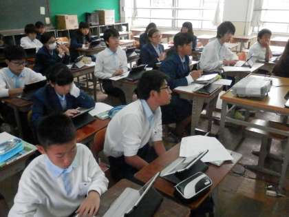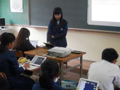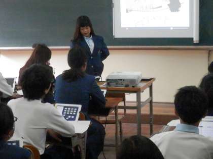 1年からです。1時間目の社会の時間、アイパットPCを使ってまとめてきた学習の発表会です。