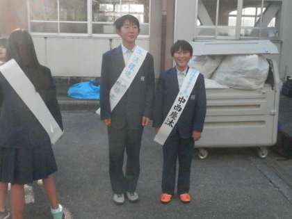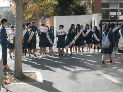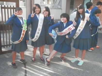 本校では、立候補者を応援する人も一緒に校門に立ちます。