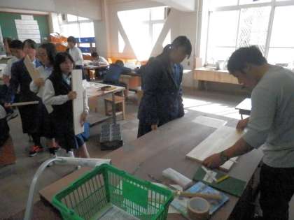 写真は技術の時間です。木材加工に挑戦中です。何ができ上がるのでしょうか。