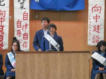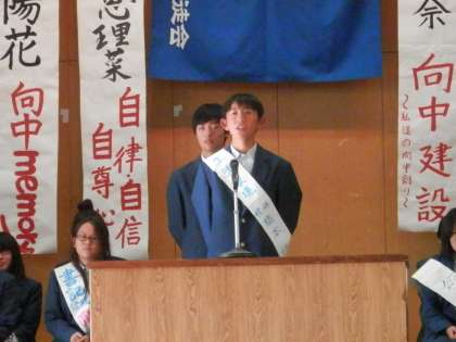 ここからは、生徒会執行部ということで、各専門委員長候補が演説に立ちます。