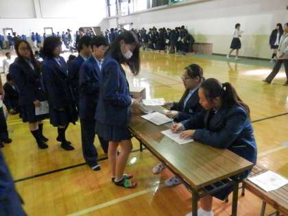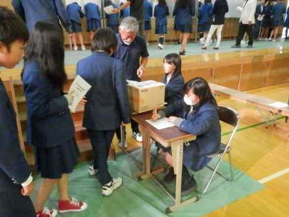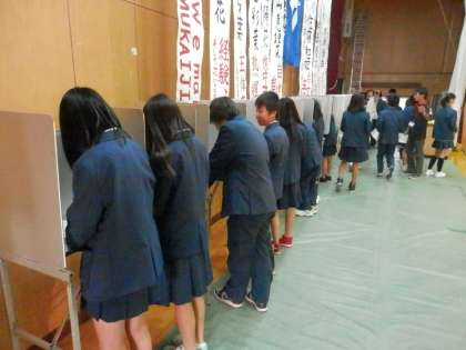 本物の記載台と投票箱を使うというやり方は、他の学校でも見たことがありますが、受付で「公約集と引き換えに投票用紙を受け取ってそれに書く」というところまで徹底しているのは初めてです。