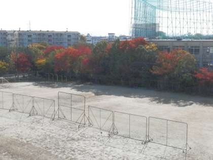 3年の教室から見たグランド周囲の木々の紅葉の様子も一緒にご覧ください。