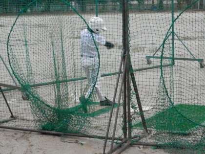 小雨が降る中、バッティング練習に精を出しています。