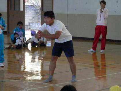すぐに「五郎丸」と分かるゼスチャーでした。幼稚園児を相手ならばっちりです。