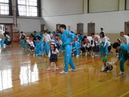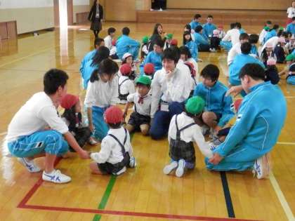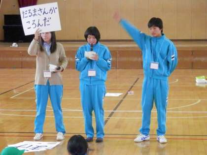 「だるまさんがころんだ」をやろうと、ゲームの説明をしています。