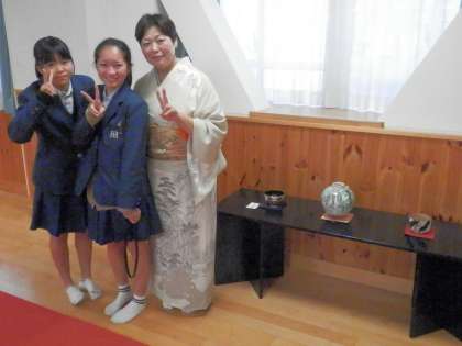 「校長先生、お茶の先生と一緒に写真撮ってください!」
