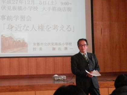 そこで、伏見西支部の小中学校のPTAが集まって人権について考える会が行われました。本校からも、PTA本部役員の方4人と教頭・教務主任、そして校長の計7人が参加しました。