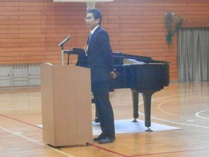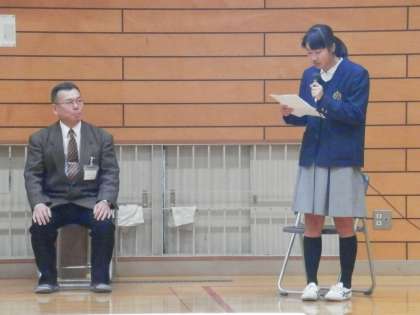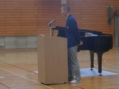 司会者の自己紹介、塩見校長先生の挨拶、そして、花山中の元生徒会長からの学年紹介です。