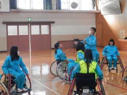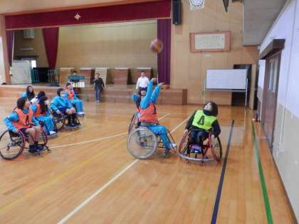 女子は、座ったままの状態だとシュートがリングまで届きません。