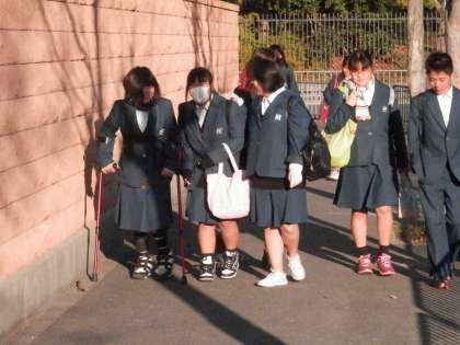 脚の手術をした生徒は、リハビリの成果もあって、随分と歩けるようになってきました。周りの子たちも、彼女ができることには手を貸さず、温かく見守りながら彼女のペースに合わせて歩きます。