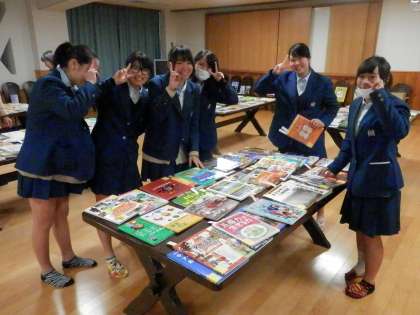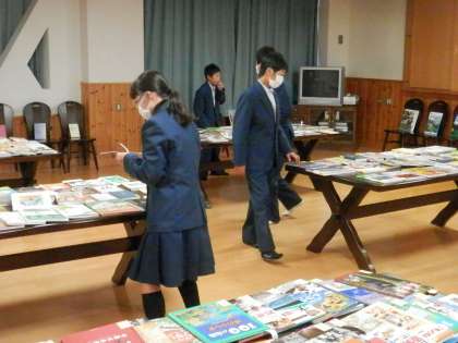 昼休みに「ブックフェア」が開かれています。図書館に入れてほしい新しい本を選ぶのです。