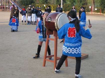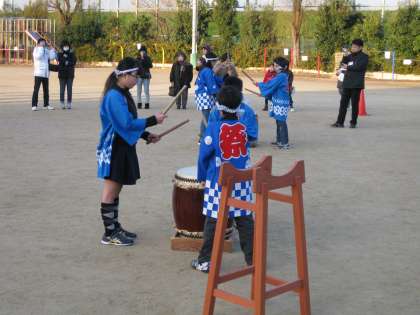 小学生による太鼓の奉納、とんどに向かっての神事のあと、火が入れられました。