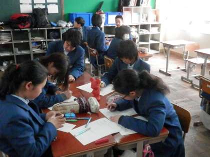 1年生は、どのクラスも国際理解教育の一環で、何やらグループ討議をしています。