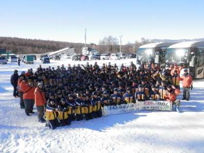 26日、まだ暗い6時前に子どもたちが集まってきます。寒そうですが笑顔です。みなワクワク感に満ちています。見慣れたエメラルドグリーンのジャージがやけに鮮やかに目に映ります。出発式が体育館で行われます。1・3年担当の教職員も全員が校内外に揃っています。生徒には「皆さんは、保護者の方をはじめ多くの人に支えられている」ということを強調しました。行きのバスの中から賑やかです。途中のSAで、積もっている雪に気持ちは一層高まります。無事に信州に到着しました。白銀の別世界です。空気は冷たく“ピーン”と張りつめ、頬に心地よく感じられます。否が応でも子どもたちのテンションは上がります。さあ、いよいよ始まります。
