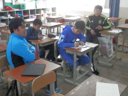 午前中に練習を終えたラグビー部の生徒の何人かが学校に居残って勉強をしています。