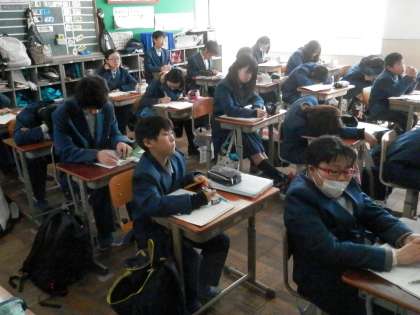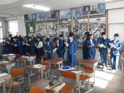 音楽の時間には、「卒業生を贈る会」で歌う合唱曲の練習をしていました。なかなかよく声が出ていました。
