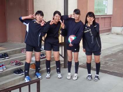 サッカー部の写真を撮って帰ってきたところ、ちょうど体育館の外へ転がり出たボールを取りに出てきた人たちが、ポーズを決めて待っていました。