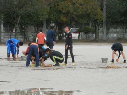 雨の上がったグランドでは、ラグビー部が「水とり」に精を出しています。