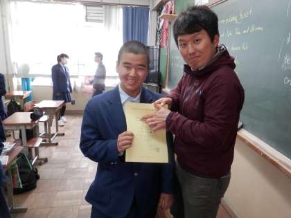 部活動の顧問の先生に「合格証」をもって報告に来ている人がいました。