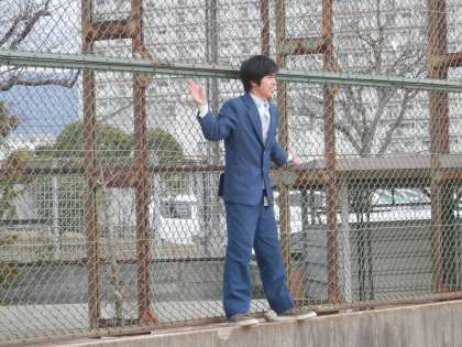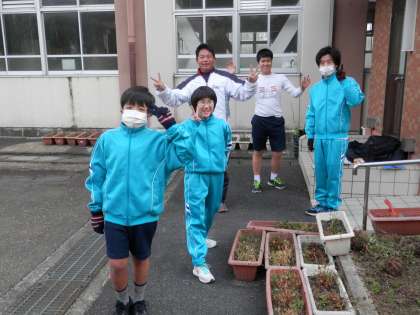 グランドで遊ぶ生徒たちを少し離れたところから先生が観察しています。