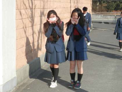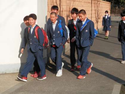 朝の春の陽ざしの中を生徒が登校してきます。