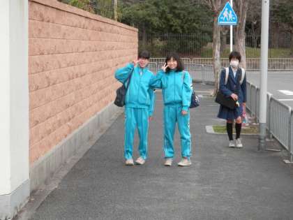 今日は3年生の校外学習です。体育のジャージで登校してきます。
