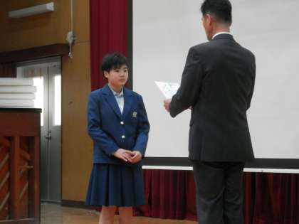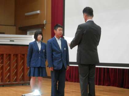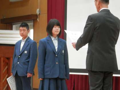 次は、卓球の新人戦と美術の作品展で優秀な成績を残した人たちの表彰です。