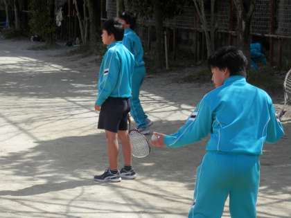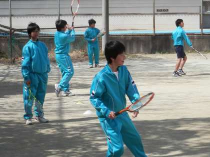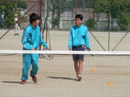暑いくらいのテニスコートでは、男女の部が熱心に練習中です。