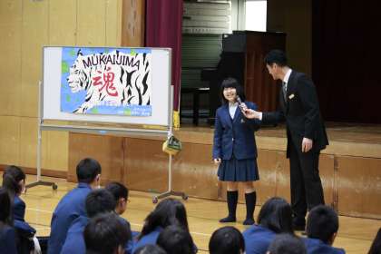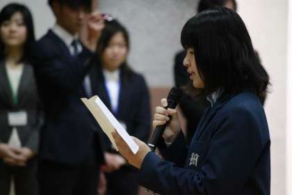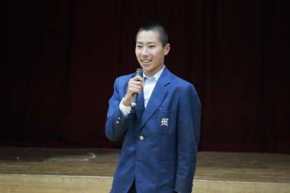 教頭先生を迎える言葉を述べる生徒代表。