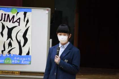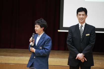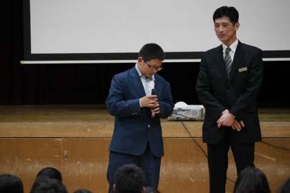 全校生徒の前で話をするのも、もう随分となれたようです。
