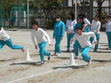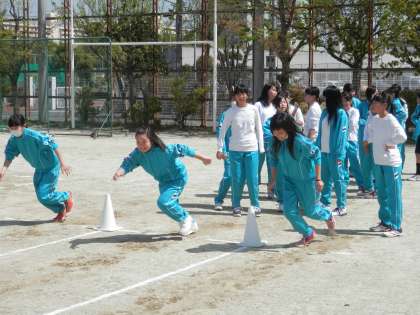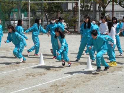 みんな頑張って50メートル走を走っています。