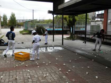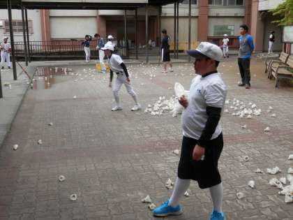 雨でグランドが使えないため、中庭でバドミントンのシャトルを打っています。