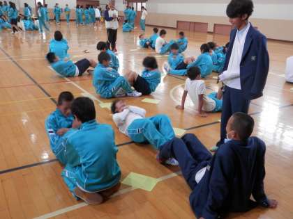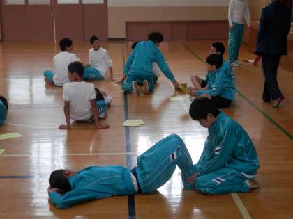 男女とも筋力の測定です。時間内に何度腹筋運動ができるかを測定します。