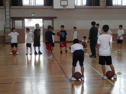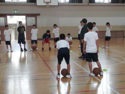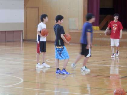 体育館では一面を使って男子バスケットボール部が練習を行っています。